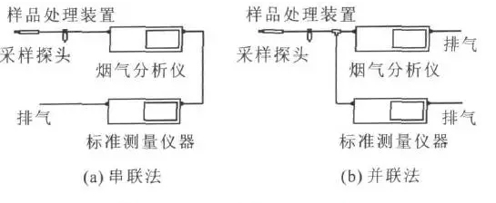為了解決煙氣分析儀傳統的校準方式不能滿足連續監測的要求這一問題,考慮引入一個標準測量儀器,將進入煙氣分析儀的氣體引入標準測量儀器,對流經煙氣分析儀的氣體進行測量,將標準測量儀器的測量結果作為被測氣體的約定真值,對煙氣分析儀進行在線校準。在線校準系統如圖3所示。煙氣經處理后進入煙氣分析儀和標準測量儀器,將兩者的測量結果進行比較,從而實現煙氣的不間斷測量,同時對煙氣分析儀進行校準。根據儀器氣路接法的不同,煙氣分析儀在線校準系統可以分為串聯法和并聯法兩種(見下圖)。
